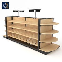 Étagères gondoles double face Étagères de présentation en bois pour commerce de détail Étagères de rangement à plusieurs niveaux Cadre en métal noir Fixations pour magasins commerciaux